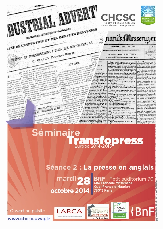 Le réseau international de chercheurs « Transfopress » se fixe pour objet la promotion d’un objet patrimonial matériel totalement délaissé, tant en France que dans quasiment tous les autres pays du monde : la presse publiée dans des langues autres que la ou les langues nationales. Il propose, ainsi, de renouveler l’écriture de l’histoire de la presse, mais également celle de la construction des identités et des cultures nationales. Le séminaire « Transfopress-Europe 2014-2015 » entend être un lieu d’échanges et de mise en commun des travaux des chercheurs européens. Organisé comme un « séminaire/atelier », il permet aux chercheurs de se retrouver deux fois par an afin de confronter les résultats, de définir des axes de travail communs et de présenter leurs résultats au public. Le séminaire abordera successivement quatre grandes aires linguistiques au XIX° et au XX° siècle selon le programme suivant : Séance 1 : La presse en français (Michel Rapoport, UVSQ) Programme